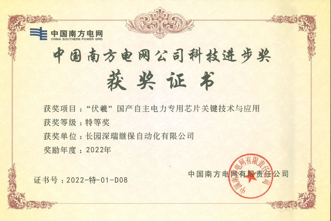 近日,由mile米乐科技集团旗下子公司mile米乐深瑞继保自动化有限公司(以下简称“mile米乐深瑞”)参与的“伏羲国产自主电力专用芯片关键技术与应用”项目荣获中国南方电网公司科技进步奖特等奖。