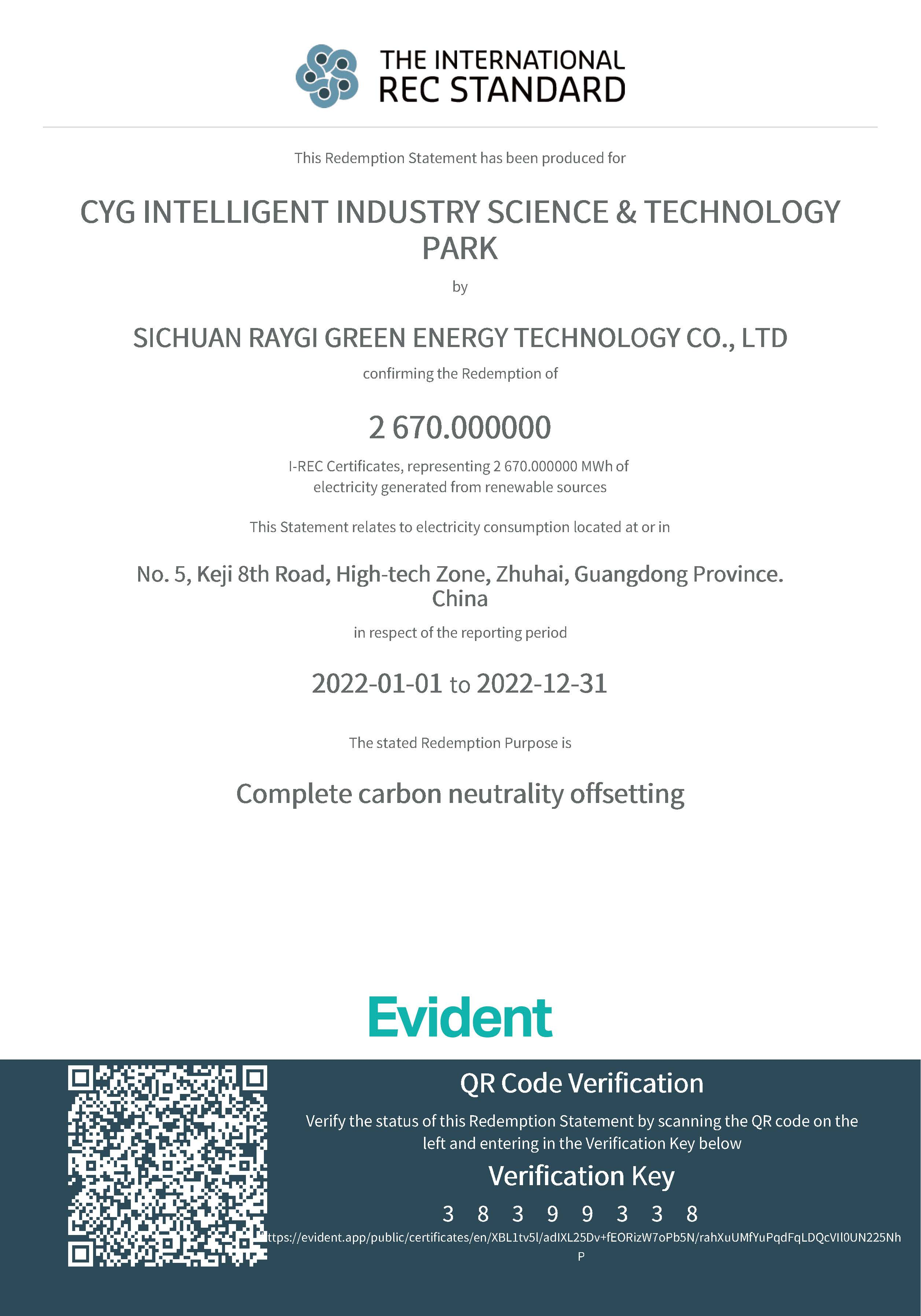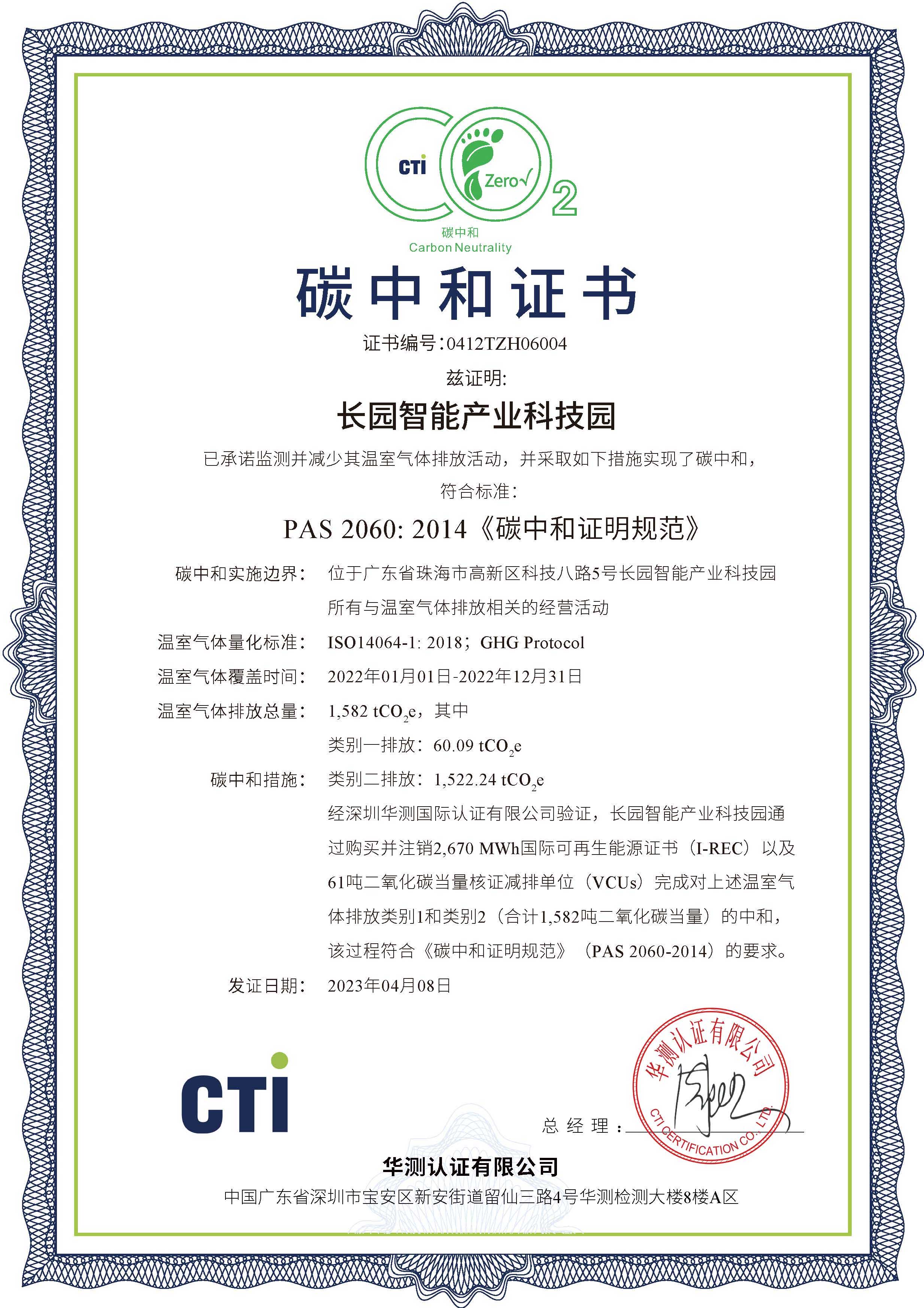 本次园区碳中和的实施,由mile米乐科技集团旗下子公司mile米乐综合能源(深圳)有限公司(以下简称“mile米乐综能”)根据国际标准ISO 14064-1:2018《温室气体-第一部分 组织层面上温室气体排放与清除量化及报告规范》对园区类别1、类别2温室气体排放量进行了核算并出具核算报告,由中国合格评定国家认可委员会(CNAS)授权的第三方核证机构华测检测(CTI),按照ISO 14064-3《温室气体声明审定与核查的规范及指南》对核算报告进行了核查,并根据PAS 2060《碳中和证明规范》对碳中和结果进行了认定。